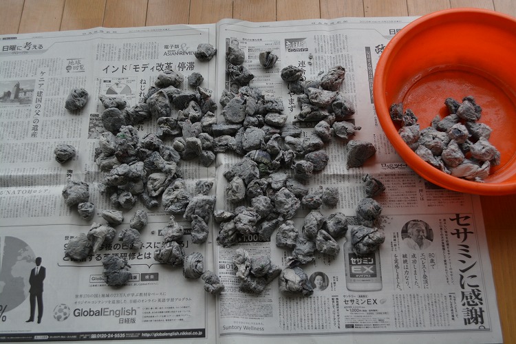ある程度、古新聞豆炭のようなモノも乾いて来ました。